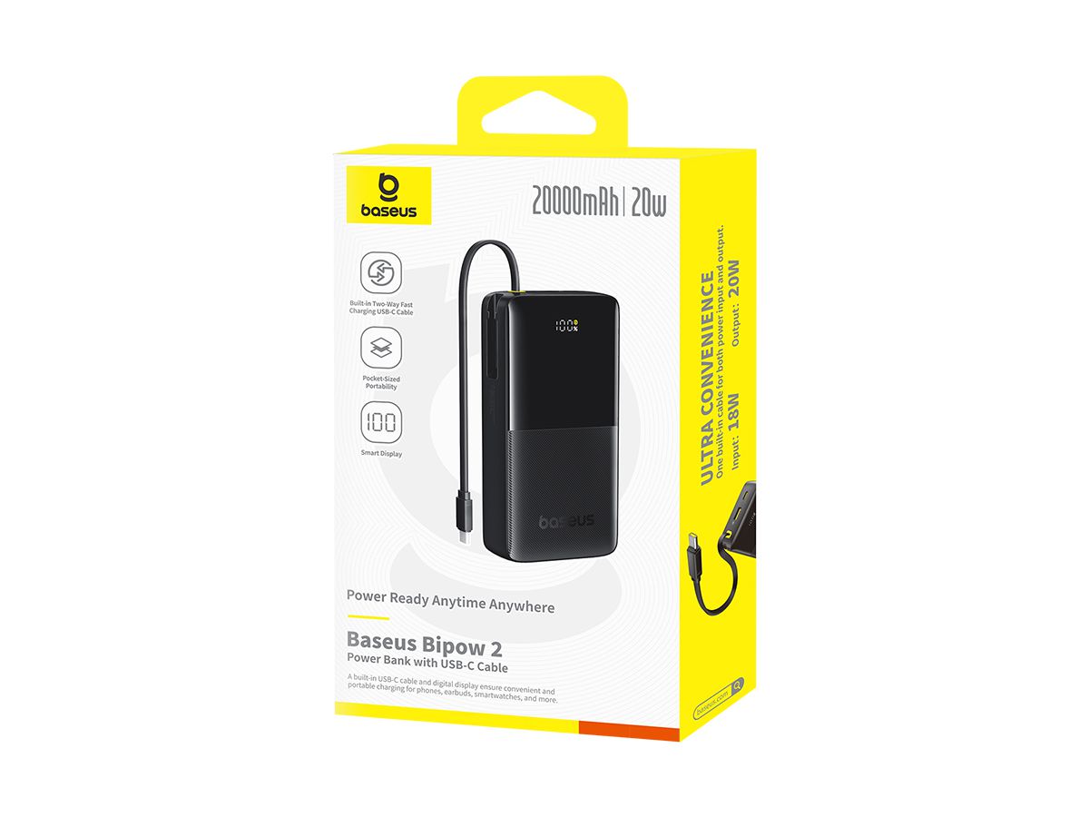 Die Baseus Bipow 2 Powerbank 20000 mAh ist tragbar im Taschenformat, was sie zu einem idealen Begleiter für unterwegs macht. Sie verfügt über ein integriertes USB-C-Kabel, das ein schnelles Laden in beide Richtungen ermöglicht, sodass du sowohl die Powerbank aufladen als auch andere Geräte schnell mit Energie versorgen kannst. Darüber hinaus bietet das Smart Display eine klare Übersicht über den Ladezustand, sodass du immer informiert bist.