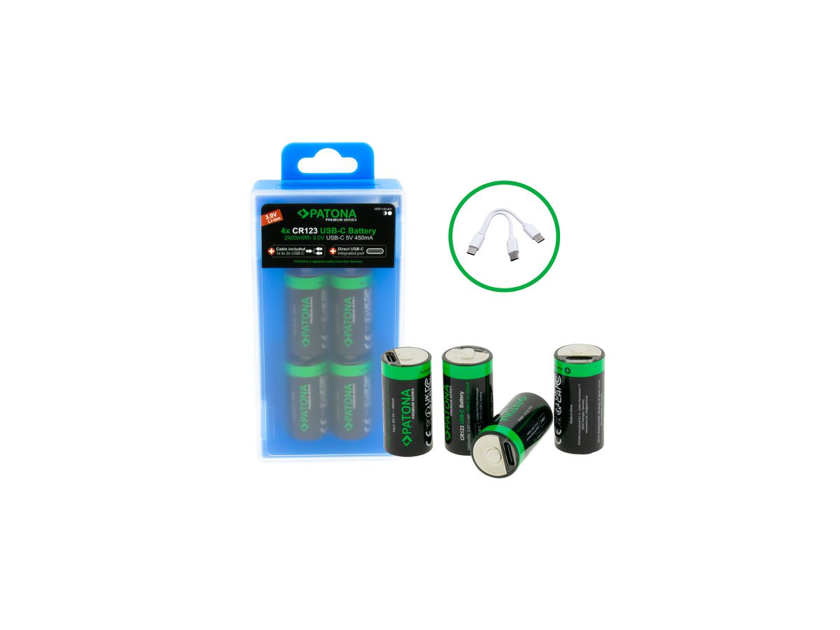 Technische Daten: Akku-Typ: CR123A Zellen Typ: Li-Ion Leistung: 3,7V Kapazität: 2400mWh/800mAh Input USB-C: 5V/450mA Schutzfunktion: BMS-Technologie (Spannungs- und Überladungsschutz) Maße je Akku: Länge x x x cm / Durchmesser x x xcm Gewicht je Akku: x x g Kompatibilitäten: Ersetzt folgende Akkumodelle: CR123A, 16340 Lieferumfang: 4x PATONA CR123A Li-Ionen-Akkus mit USB-C 1x USB-C zu 2fach USB-C Kabel Mit dem USB-C-Eingang lassen sich die PATONA Premium CR123A USB-C Akkus schnell und komfortabel mit dem beigefügten 1-zu-2 USB-C-Kabel und diversen Ladegeräten wie Powerbanks, Autoladegeräten, PCs oder GaN-Adaptern aufladen. Main Features: Highlight: USB-C Input: 5V / 450mA Schnellladefähigkeit: Die CR123A-Akkus sind schnellladefähig Memoryeffekt: nicht vorhanden Ladezyklen: über 1000 Lade- und Entladezyklen Selbstentladung: sehr gering (bei Nichtgebrauch sind innerhalb von 3 Jahren noch 60% der Leistung vorhanden) Ladeanzeige: integrierte LED
