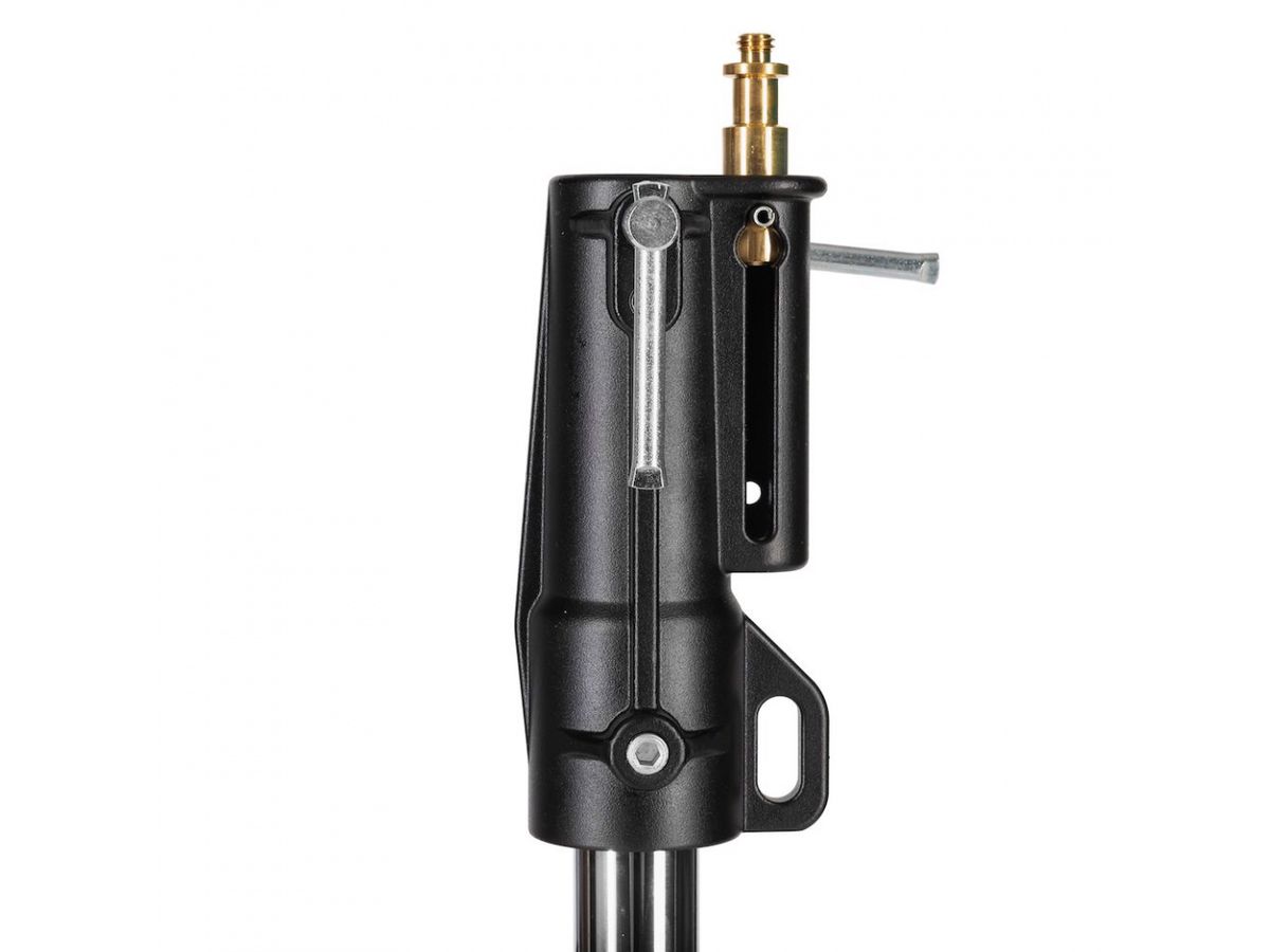 Trépied de lampe robuste en tubes d'acier chromé. Le pied dispose d'une rallonge et est équipé d'une tête de fixation universelle. Celle-ci est dotée d'une douille de 1 1/8 », dans laquelle il est possible d'insérer des luminaires et des accessoires lourds avec un pivot de 28 mm.Sur le côté se trouve une douille de 5/8 » (16 mm) dans laquelle se trouve un pivot extensible de 16 mm. Il est ainsi possible de monter des luminaires et des accessoires avec une douille de 5/8 » ou d'utiliser des bras de fixation et des accessoires de préhension avec un pivot de 16 mm. Des cordes de sécurité peuvent être fixées à un illet robuste.La base symétrique du trépied dispose de deux blocages. Le tube central peut ainsi être abaissé jusqu'au sol.