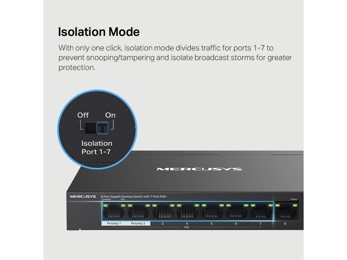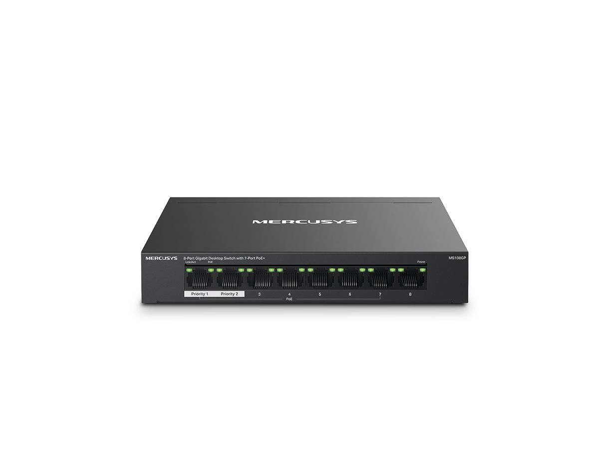 Der Mercusys MS108GP ist ein leistungsstarker Desktop-Switch, der speziell für die Anforderungen moderner Netzwerke entwickelt wurde. Mit 8 Gigabit Ethernet Ports, von denen sieben Power over Ethernet (PoE+) unterstützen, ermöglicht dieser Switch eine effiziente und flexible Netzwerkverbindung. Die PoE-Funktionalität erlaubt es, Geräte wie IP-Kameras und Access Points über das Ethernet-Kabel mit Strom zu versorgen, was die Installation vereinfacht und zusätzliche Stromquellen überflüssig macht. Der Switch bietet eine webbasierte Managementoberfläche, die eine einfache Konfiguration und Überwachung des Netzwerks ermöglicht. Mit einer MAC-Adressentabelle von 8000 Einträgen und Unterstützung für verschiedene Netzwerkstandards ist der MS108GP ideal für kleine bis mittelgrosse Unternehmen, die eine zuverlässige und skalierbare Netzwerkverbindung benötigen. Das robuste Metallgehäuse und die Möglichkeit zur Wandmontage sorgen für eine flexible Installation in unterschiedlichen Umgebungen.